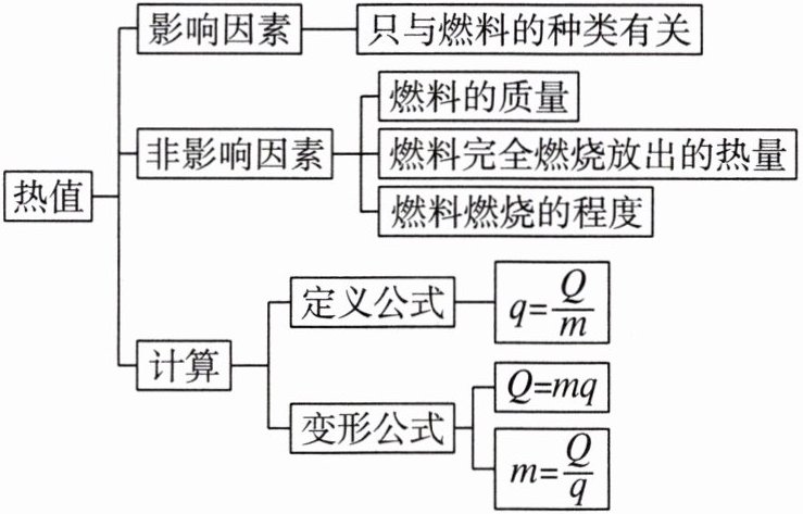 热值$\left\{\begin{array}{l}影响因素\to 只与燃料的种类有关\\ 非影响因素\to \left\{\begin{array}{l}燃料的质量\\ 燃料完全燃烧放出的热量\\ 燃料燃烧的程度\end{array} \right. \\ 计算\to \left\{\begin{array}{l}定义公式\to q= \frac{Q}{m}\\ 变形公式\to \left\{\begin{array}{l}Q= mq\\ m= \frac{Q}{q}\end{array} \right. \end{array}\right. \right. \end{array}\right. \right. \right.$