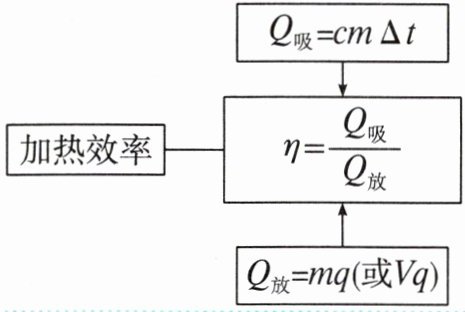 加热效率$\to \left\{\begin{array}{l}{Q}_{吸}= cm\Delta t\\ \eta =\frac{{Q}_{吸}}{{Q}_{放}}\\ {Q}_{放}= mq(或Vq)\end{array} \right.$