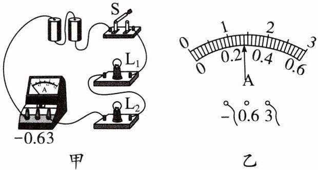 7. 如图甲所示,S 闭合后,两灯都发光,电流表 A 的示数如图乙所示,则通过灯泡$ L_1 $的电流是