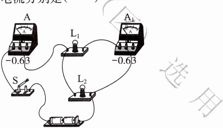 5. 如图所示的实验电路,闭合开关S后,电流表A的示数为0.5 A,电流表$A_1$的示数为0.3 A。则通过小灯泡$L_1、$$L_2$的电流分别是(