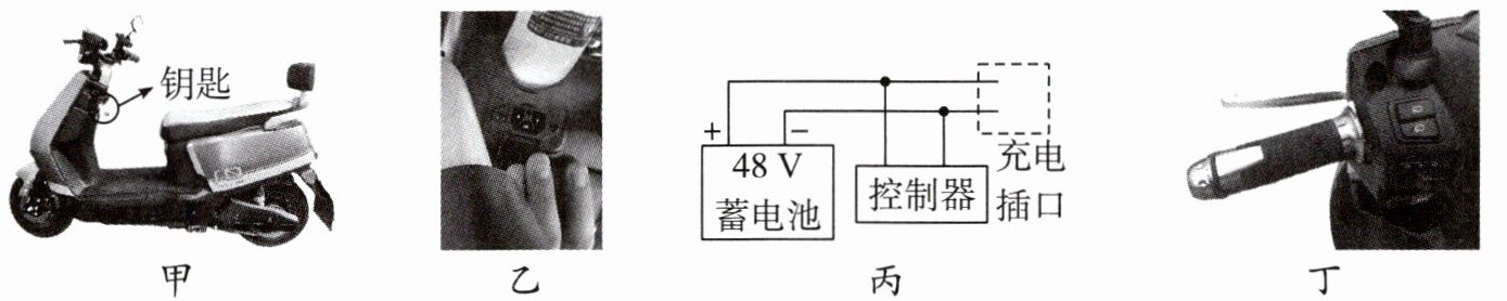 (1)图乙是电动车的充电插口,内有金属插脚,在使用过程中绝不能拿硬币、手等去触碰;图丙是电动车的局部电路图,其中控制器是指电动车利用蓄电池工作的所有用电器。如果硬币碰到充电插口的两个金属插脚,可能会造成_________(选填“蓄电池”“控制器”或“充电插口”)损坏。
