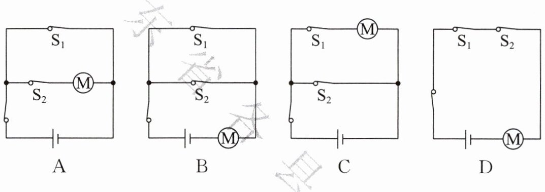 (3)电动自行车两刹车手柄(如图丁所示)中各有一只开关$S_1$和$S_2。$在行驶中用任一只手柄刹车时,该手柄上的开关立即断开,电动机停止工作,以下电路符合要求的是_________。