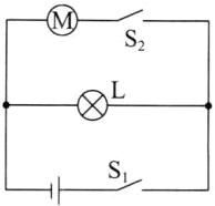 (4)根据题意可知,开关$S_{1}$闭合,指示灯L亮,但电机不工作,说明开关$S_{1}$控制指示灯;开关$S_{2}$闭合,电动机才通电工作,说明开关$S_{2}$控制电动机;电动机和指示灯互不影响,是并联接入电路中的;若只闭合开关$S_{2}$,电动机不工作,说明开关$S_{1}$也控制电动机,即开关$S_{1}$在干路上,开关$S_{2}$与电动机在一条支路上,指示灯在另一条支路上。