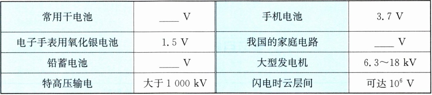 $V$|手机电池|$3.7V$||电子手表用氧化银电池|$1.5V$|我国的家庭电路|