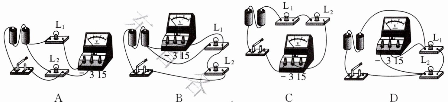 3. 下图是四个用电压表测量灯$L_{1}$两端电压的实物连接图,正确的是( )