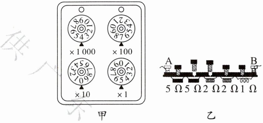Ω。图乙所示的是插入式电阻箱,当铜塞插入间隙时,相应的电阻被短路,图中A、B两个接线柱之间的电阻值是7