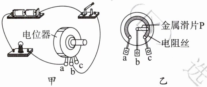 8. 小华用电池组、小灯泡、电位器、导线和开关组成了一个调光电路,如图甲所示。图乙是电位器的内部构造示意图。闭合开关后,电位器的______(选填“aP”或“cP”)段接入电路,小华将电位器的金属滑片P顺时针转动时,改变了电阻丝接入电路中的______(选填“材料”“长度”或“横截面积”),使小灯泡的亮度变______(选填“亮”或“暗”)。