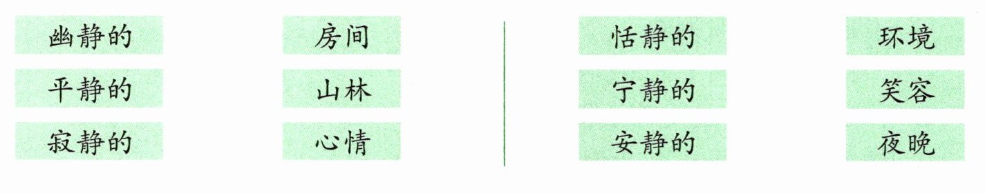 幽静的—山林;平静的—心情;寂静的—环境;恬静的—笑容;宁静的—夜晚;安静的—房间