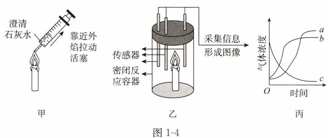 7. 某化学兴趣小组通过微型实验探究蜡烛燃烧的产物,用数字化装置监测密闭容器内蜡烛燃烧时氧气、二氧化碳和水蒸气含量的变化,如图1-4乙所示,得到的三条曲线如图1-4丙所示,下列说法不正确的是(