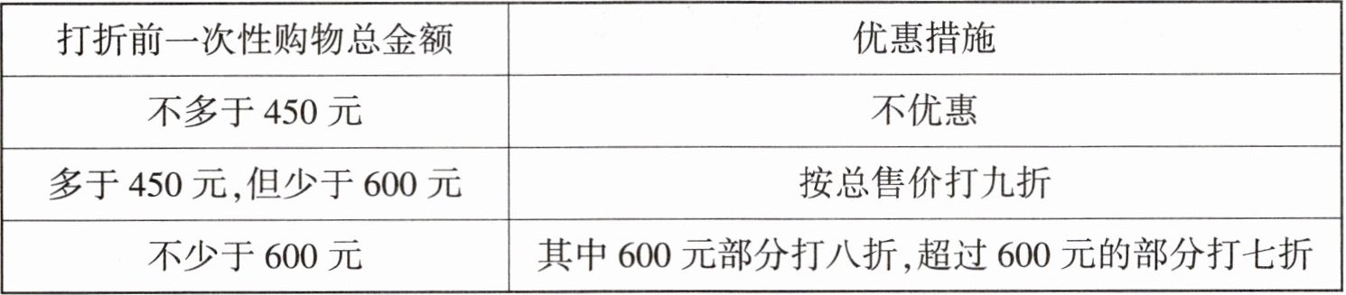 (3)设小华打折前应付款y元.①打折前购物金额多于450元,但少于600元,根据题意,得$ 0.9y=522 $,解得$ y=580 $;②打折前购物金额不少于600元,$ 600×0.8+(y-600)×0.7=522 $,解得$ y=660 $.答:若没有优惠促销,小华在该商场购买同样的商品要付580元或660元.