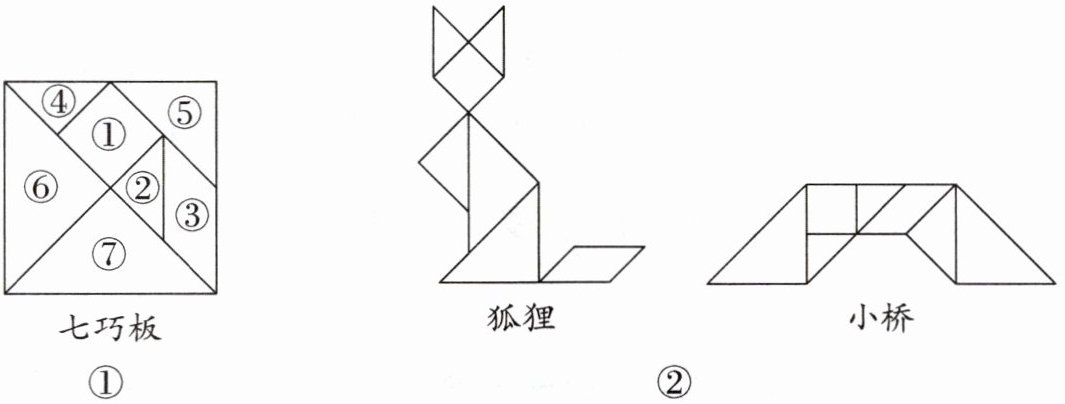 9. 七巧板(如图①)游戏是我国古代人民创造的益智游戏,用七巧板可以拼出许多图形,如狐狸和小桥(如图②),你知道它们的各部分分别是七巧板中的哪一块图形吗?请在图中标出来.