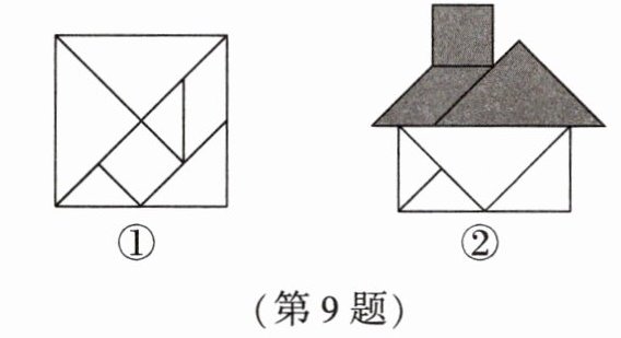 9. 如图①,分割边长10 cm的正方形,制作一副七巧板,图②是用其拼成的“小房子”,其中阴影部分的面积为