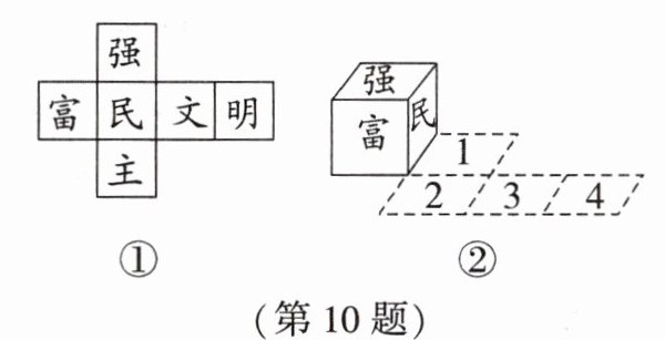 10. 把图①所示正方体的展开图围成正方体(文字露在外面),再将这个正方体按照图②所示依次翻滚到第1格、第2格、第3格、第4格,此时正方体朝上一面的文字为