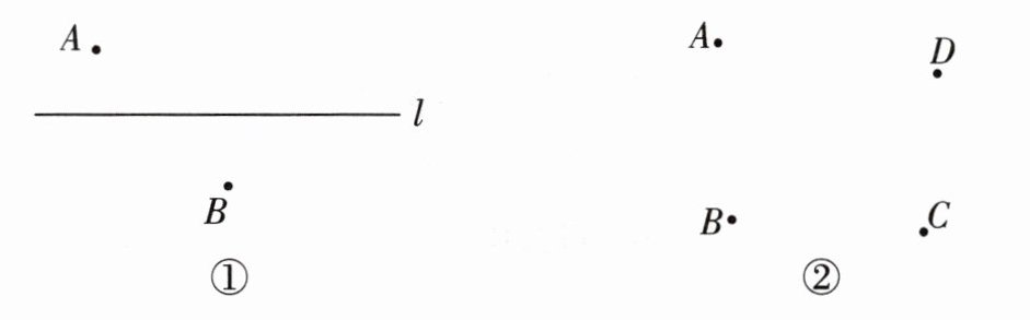 10. (1)如图①,A,B是公路l两旁的两个村庄,若两村庄要在公路上合修一个汽车站P,使它到A,B两村的距离之和最小,试在l上标注出点P的位置.