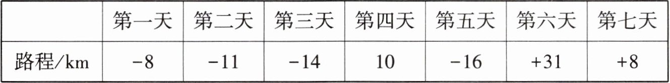 10. 小明连续记录了他家电动汽车7天中每天行驶的路程(如表),以50 km为标准,多于50 km的记为“+”,不足50 km的记为“-”.