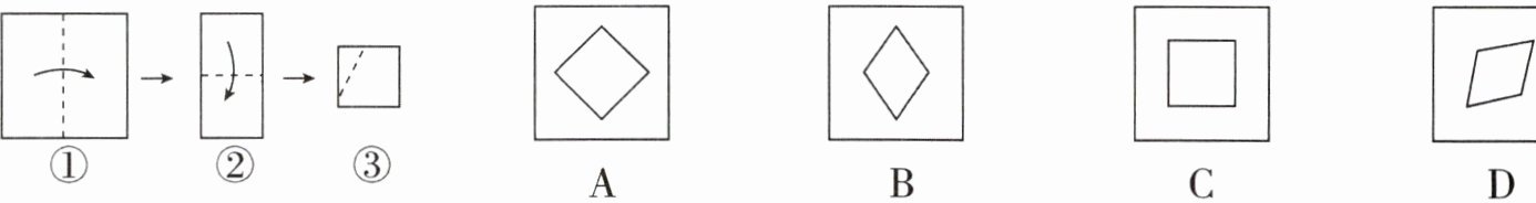 4. (绍兴中考)将一张正方形纸片按如图所示的步骤①②沿虚线对折两次,然后沿③中的虚线剪去一个角,展开铺平后的图形是 (