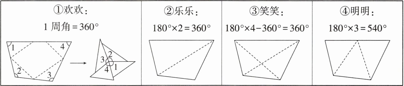 (1)①欢欢:把四边形四个角剪下来拼成一个周角,方法正确;②乐乐:把四边形分割成两个三角形,两个三角形的内角和等于四边形的内角和,方法正确;③笑笑:把四边形分割成四个三角形,四个三角形的内角和减去一个周角度数就是这个四边形的内角和,方法正确;④明明:把四边形分割成三个三角形,四边形的内角和等于三个三角形的内角和减去一个平角度数,明明列式错误.