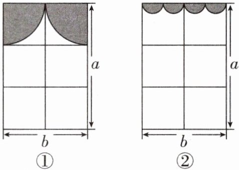 方案①窗户射进阳光的面积为$ab-\frac{1}{2}\pi (\frac{b}{2})^{2}=ab-\frac{\pi b^{2}}{8}$;方案②窗户射进阳光的面积为$ab-2\pi (\frac{b}{8})^{2}=ab-\frac{\pi b^{2}}{32}$.因为$\frac{\pi b^{2}}{8}>\frac{\pi b^{2}}{32}$,所以$ab-\frac{\pi b^{2}}{8}<ab-\frac{\pi b^{2}}{32}$,所以方案①窗户射进阳光的面积<方案②窗户射进阳光的面积,即方案②窗户射进阳光的面积大.