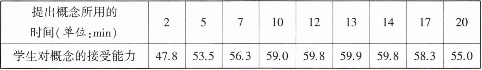 由表中数据可知,当提出概念所用的时间在2 min到13 min时,学生对概念的接受能力在增强;当提出概念所用的时间在13 min到20 min时,学生对概念的接受能力在减弱.