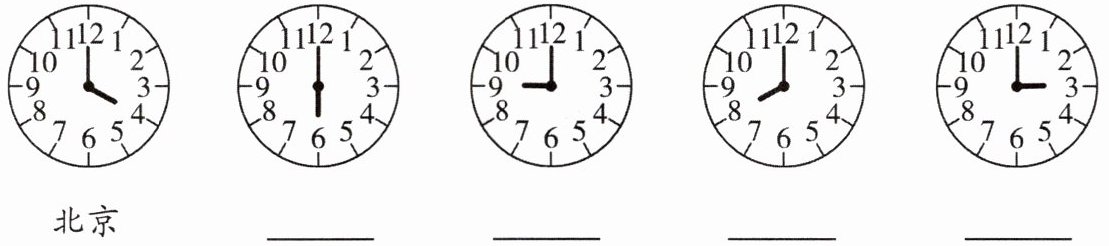 (2)下面的五个时钟显示了同一时刻北京时间和国外四个城市的时间,请根据时差信息,分别在时钟的下方标明所在城市的名称.
