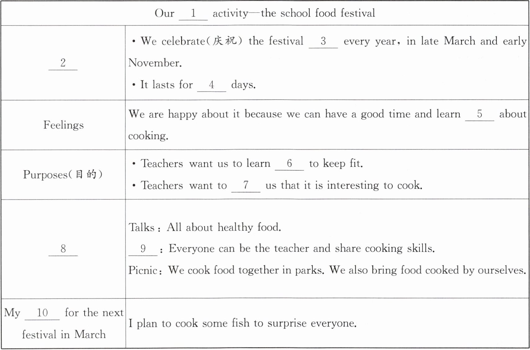 | Purposes(目的) | • Teachers want us to learn 6 to keep fit. • Teachers want to 7 us that it is interesting to cook. |
