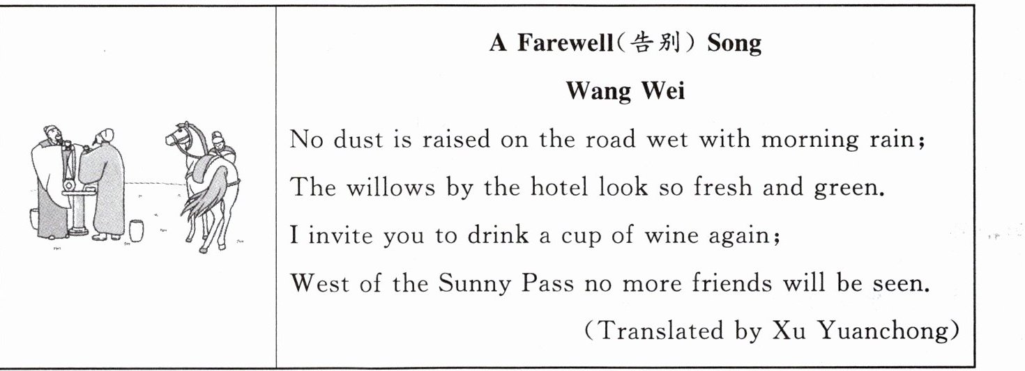 Friends are important in our lives, but we sometimes have to separate from our friends. A Farewell Song is about saying goodbye to a friend. It is a famous poem by Wang Wei, a great poet, who lived in the Tang Dynasty. He is good at writing poems and drawing. When talking about Wang Wei, people often say there are pictures in his poems and there are poems in his pictures.