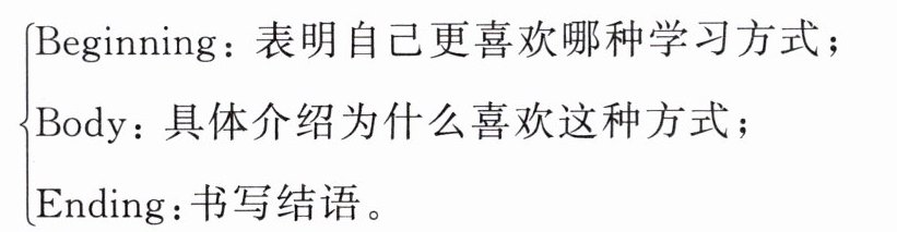 1.审题:本篇写作的主题与学习方式有关,要求从表格中选取一种你喜欢的学习方式,并根据提示内容进行写作,适当添加细节,并突出写作重点。