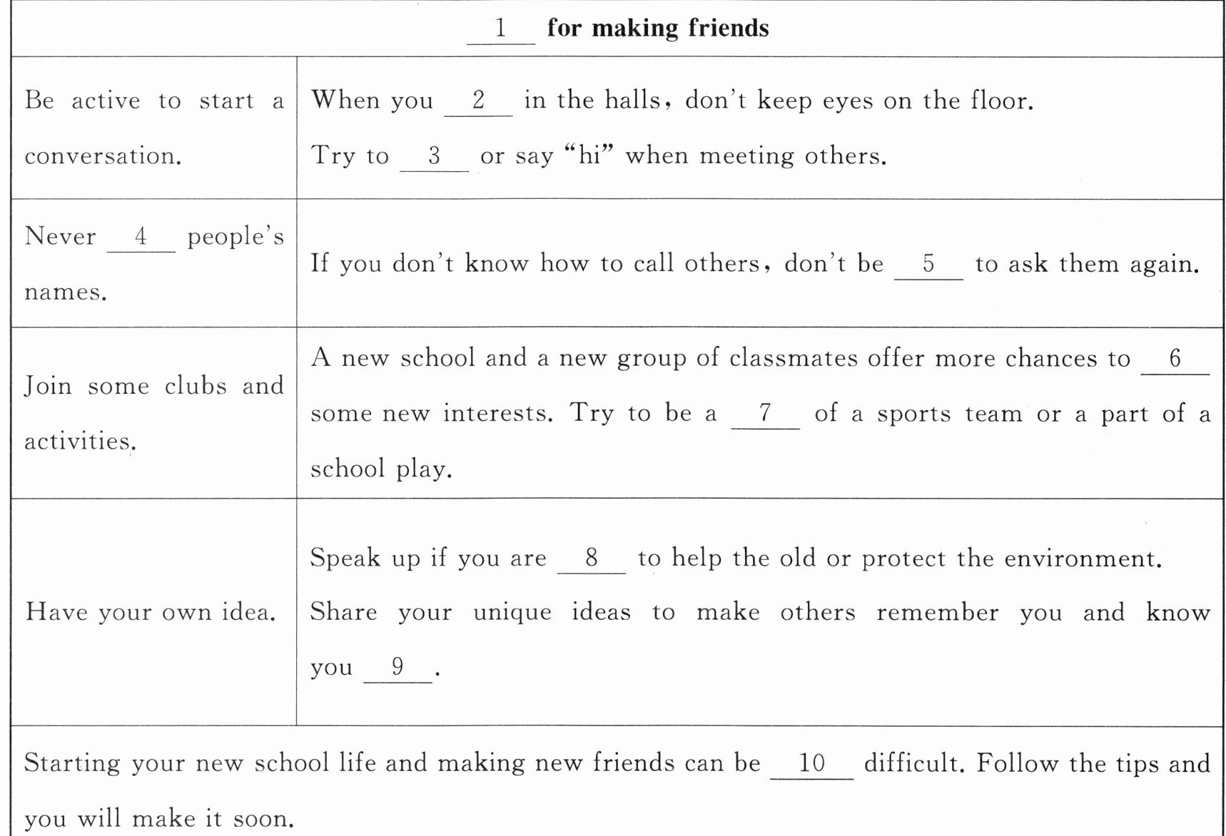 Have your own idea. Do you want to help the old or protect the environment? Speak up. Share your unique ideas in the new school. Your new schoolmates will remember you at once. They are more likely to talk with you and know more about you. Then you will be able to make new friends.