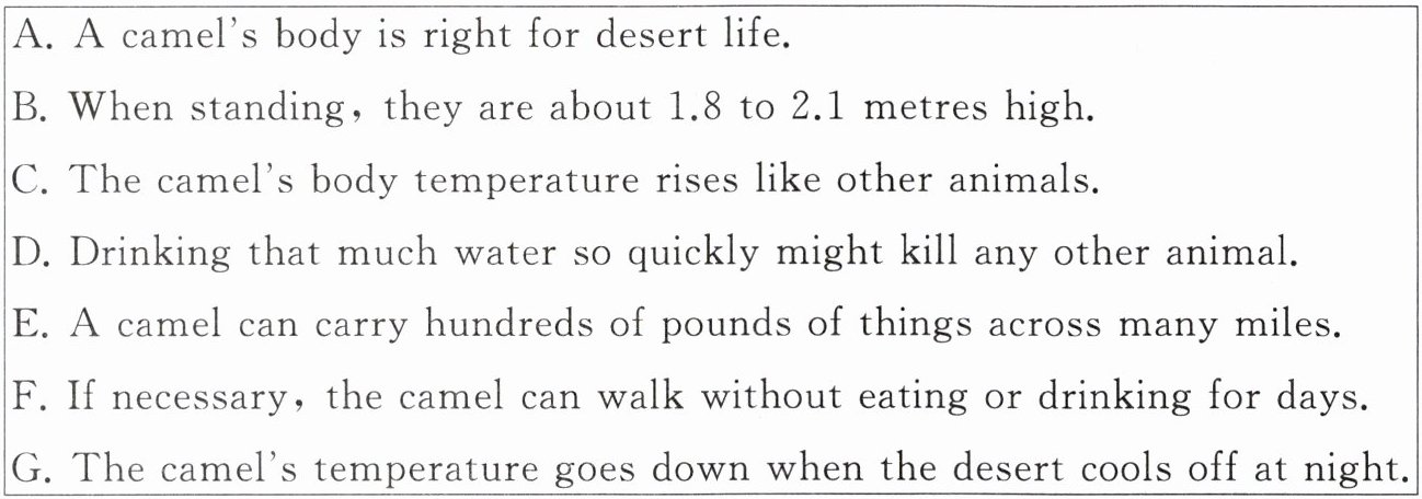 On a desert trip, a camel needs very little food and water. Its special body part keeps fat so it can go without eating for days. Also, its body temperature can go up by more than 10°F before it has sweat(汗). In this way, the camel doesn't lose as much water from sweat as a horse or a person would. 4 When the weather is cool, camels can go for as long as several months without water.