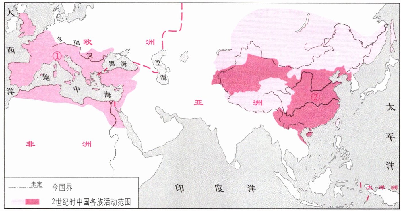 (1) 公元2世纪,材料一地图中①②两处是同时存在的两个国家。它们是( )。
