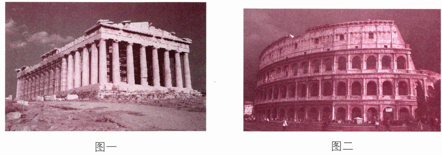 (1)图一是雅典帕特农神庙,图二是罗马大竞技场。(2)希腊、罗马。(3)希腊建筑艺术主要体现在神庙,神庙四周以廊柱环绕,柱身有粗有细。罗马建筑吸收了希腊建筑的特点,并有所创新,如石拱门、穹顶等,既坚固结实,又华丽宏伟。
