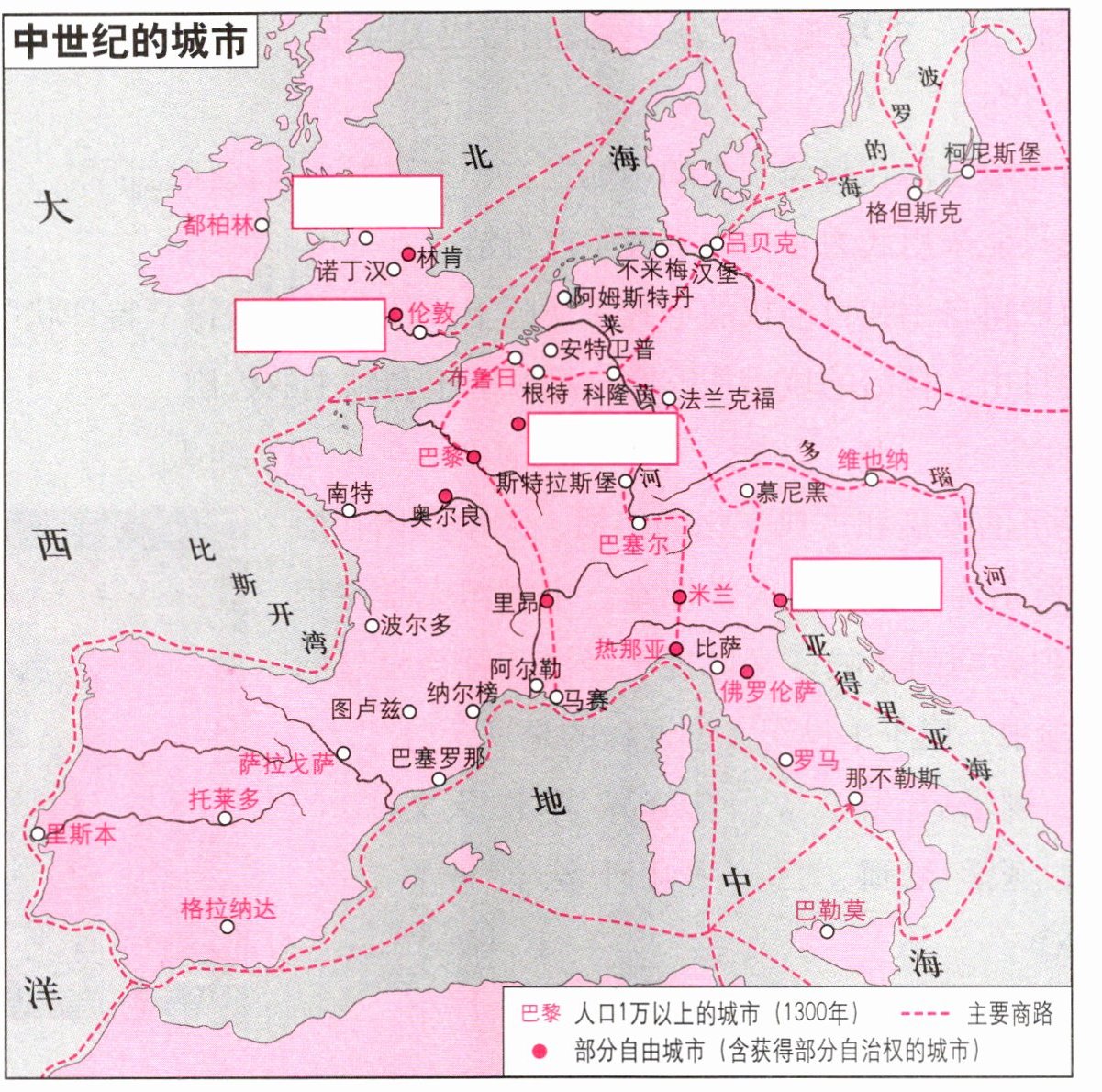 (2) 观察地图,中世纪西欧城市在地域分布上有何特点?