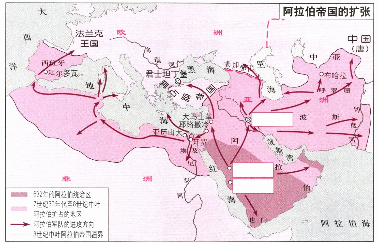 (2)到8世纪中期,阿拉伯国家已成为地跨亚、欧、非三洲的大帝国。看图并结合所学知识,描述阿拉伯帝国扩张的过程。______