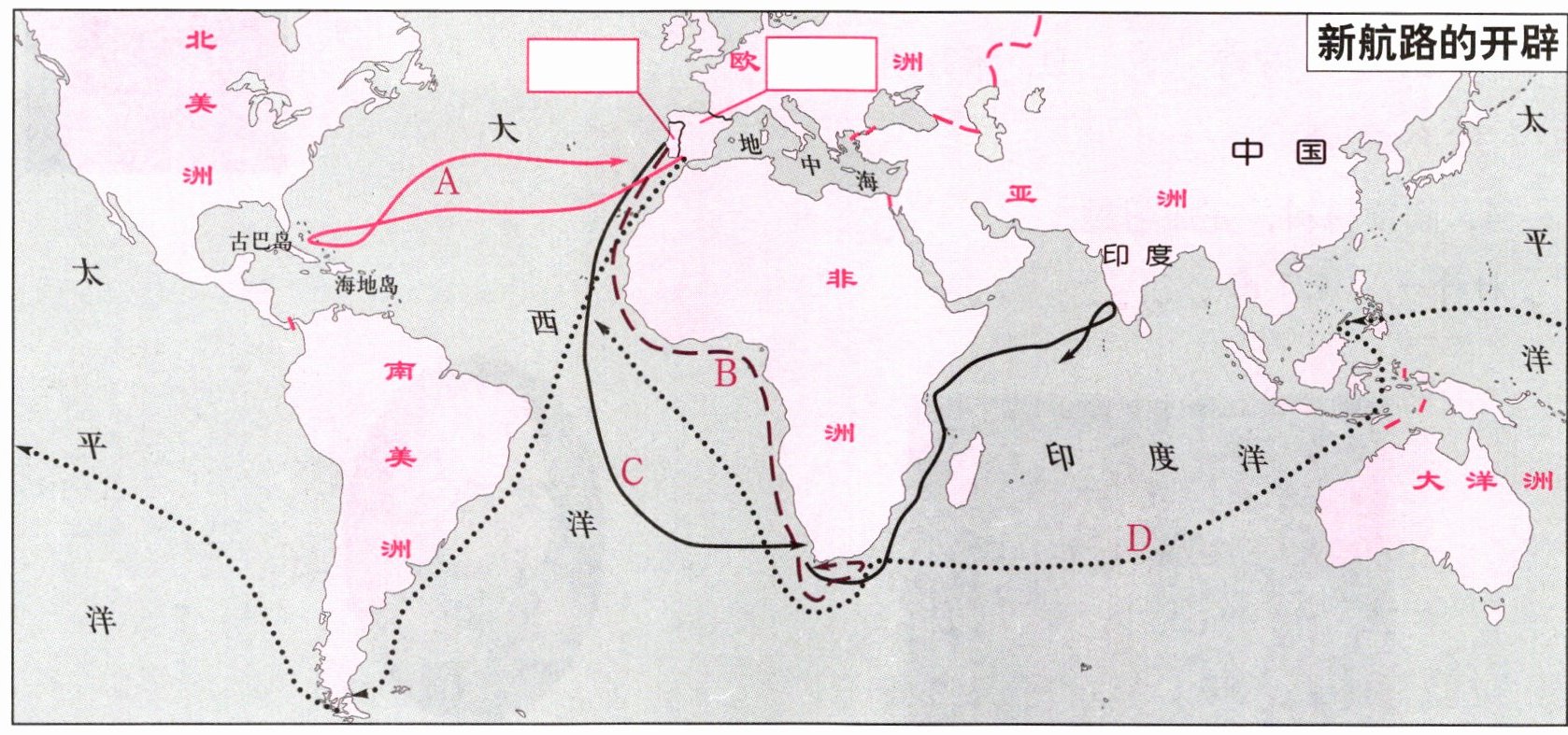 (3)地图中的D航海路线是从大西洋出发,向西经______洋、______洋,又回到大西洋。