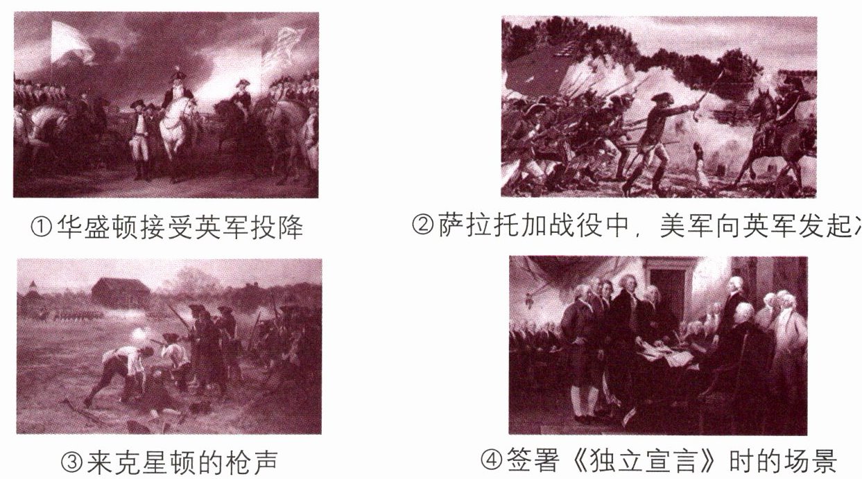 (1)图③:来克星顿的枪声激发了北美殖民地人民的抵抗热情,各地人民纷纷组织起来,武装支援波士顿,该历史事件标志着美国独立战争的开始。图④:《独立宣言》宣告北美13个殖民地脱离英国独立,美国诞生。(2)③④②① (3)联邦制共和国。(4)1787年美国宪法。影响:1787年美国宪法是世界上第一部资产阶级成文宪法,对后来许多国家的政治变革产生了重要影响。但是,1787年美国宪法也有很多不足之处,如允许奴隶制的存在,不承认妇女、黑人和印第安人具有和白人男子相等的政治权利。①国会 ②司法权