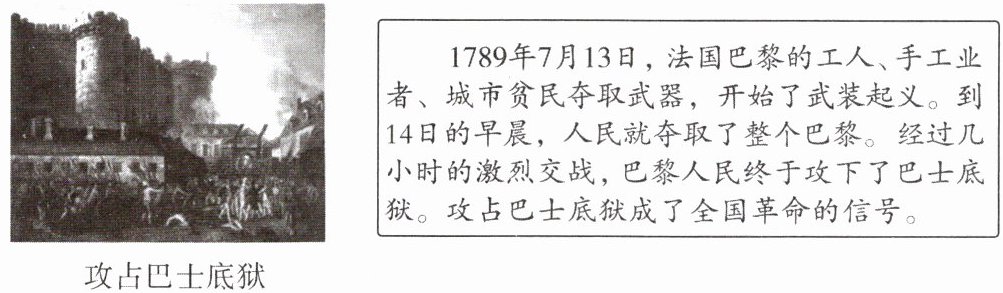 1789年7月13日,法国巴黎的工人、手工业者、城市贫民夺取武器,开始了武装起义。到14日的早晨,人民就夺取了整个巴黎。经过几小时的激烈交战,巴黎人民终于攻下了巴士底狱。攻占巴士底狱成了全国革命的信号。