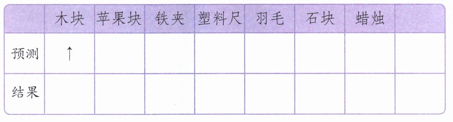 【解析】:本题主要考查不同物品在水中的沉浮情况,需要根据生活经验和所学知识对每种物品进行预测并记录实际结果。对于预测部分,要依据对物品材质、密度等特性的了解来判断其在水中的沉浮;对于结果部分,通过实际将物品放入水中观察来得出。