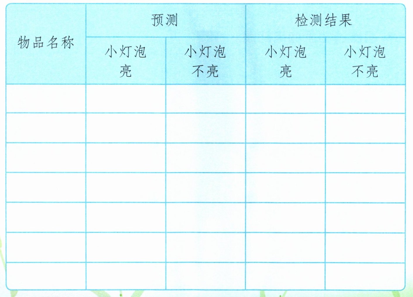 判断哪些物品容易导电,先预测,再检测。(在相应的空格里画“√”)