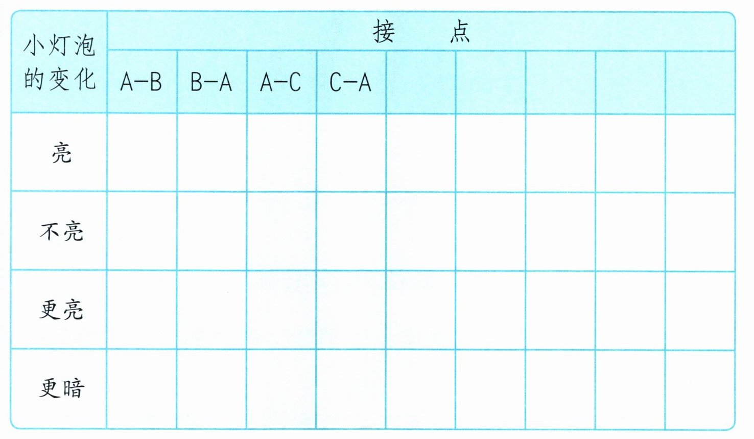 解释:当接点为A - B和B - A时小灯泡亮,说明A和B之间是通路;当接点为A - C和C - A时小灯泡不亮,说明A和C之间是断路。由于题目未给出更亮和更暗的相关信息,所以这两行暂不填写。图略(本题主要在于表格分析,无特殊图形绘制要求)。