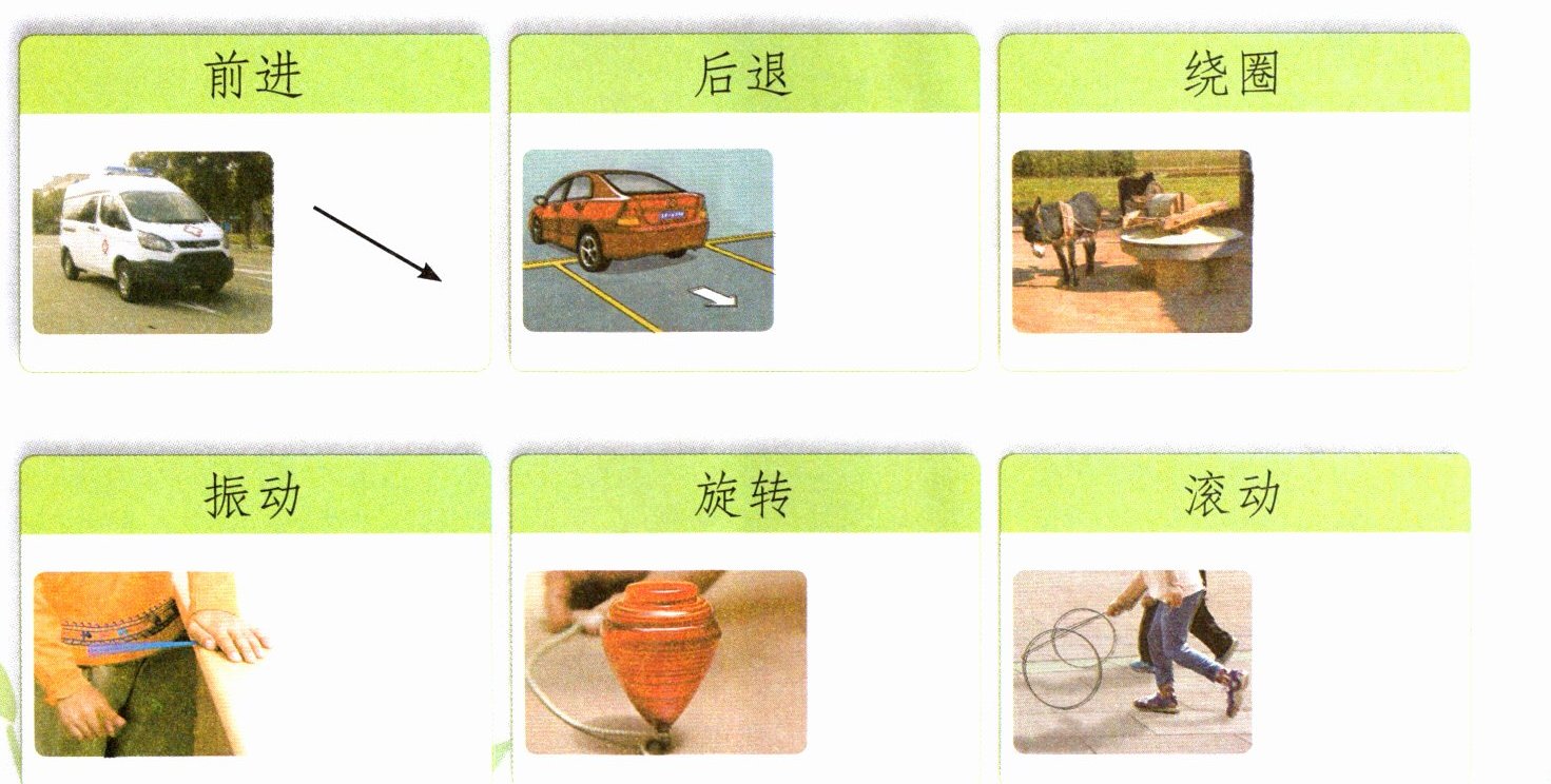 本题考查对不同物体运动轨迹的简单图示表示,涉及前进、后退、绕圈、振动、旋转、滚动等不同的运动形式,需要根据每种运动的特点进行图示表示。