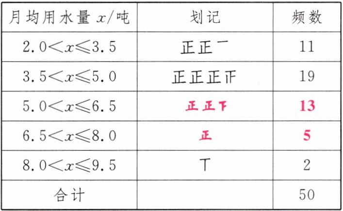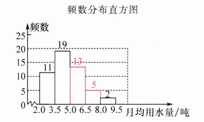 (2)从频数分布直方图可以看出:①居民月均用水量大部分在2.0~6.5吨之间;②居民月均用水量在8.0~9.5吨范围内的最少,只有2户。(答案不唯一,合理即可)
