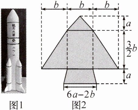 16.新考向 真实情境(2024•南阳卧龙区期中)某校的一个数学兴趣小组参加了学校科技节比赛,制作了如图1所示的航天火箭模型,为了向全校同学宣传自己的科技作品,用KT板制作了如图2所示的宣传版画,它是由一个三角形、两个梯形组成,已知KT板(阴影部分)的尺寸如图2所示.(1)用含a,b的代数式表示图2的KT板模型的总面积(结果需化简);(2)若a+b=7,ab=$\frac{25}{2}$,求KT板的总面积.
