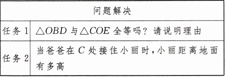 解:任务1:全等.理由如下:∵BD⊥OA,CE⊥OA,∴∠BDO=∠OEC=90°.∵∠BOC=∠BOD+∠EOC=90°,∠BOD+∠DBO=90°,∴∠DBO=∠EOC.在△BOD和△OCE中,∠BDO=∠OEC,∠DBO=∠EOC,BO=OC,∴△BOD≌△OCE(AAS).任务2:设OA的延长线与地面交于点M.∵△BOD≌△OCE,∴BD=OE=1.4m,EC=OD=1.8m.∴EM=OD+DM-OE=1.8+1-1.4=1.4(m).