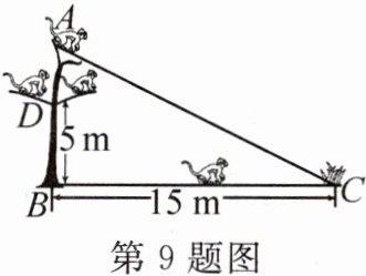 9.湖南师大附中校本经典题 如图,在一棵树的5 m高的D处有两只猴子,其中一只猴子从树上爬下来走向离树15 m的草丛C处(D→B→C),而另一只猴子爬到树顶A处后沿绳子滑行到草丛C处.若两只猴子经过的路程相等,则这棵树AB的高度是