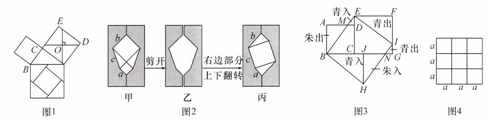 探索勾股定理的无字证明——教材P138“数学活动”变式阅读与思考:请阅读下列材料,完成相应任务.从勾股定理的“无字证明”谈起在勾股定理的学习过程中,我们已经学会运用一些几何图形验证勾股定理.图1是古印度的一种证明方法:过正方形ADEC的中心O作两条互相垂直的直线,将正方形分成4份,所分成的四部分和一小正方形恰好能拼成一个大正方形.这种方法,不用运算,单靠移动几块图形就直观地证明了勾股定理,这种根据图形直观推断或验证数学规律和公式的方法,简称为“无字证明”.意大利著名画家达·芬奇用如图2所示的方法证明了勾股定理,其中图甲的空白部分是由两个正方形和两个直角三角形组成,图丙的空白部分由两个直角三角形和一个正方形组成.设图甲中空白部分的面积为S₁,图丙中空白部分的面积为S₂.