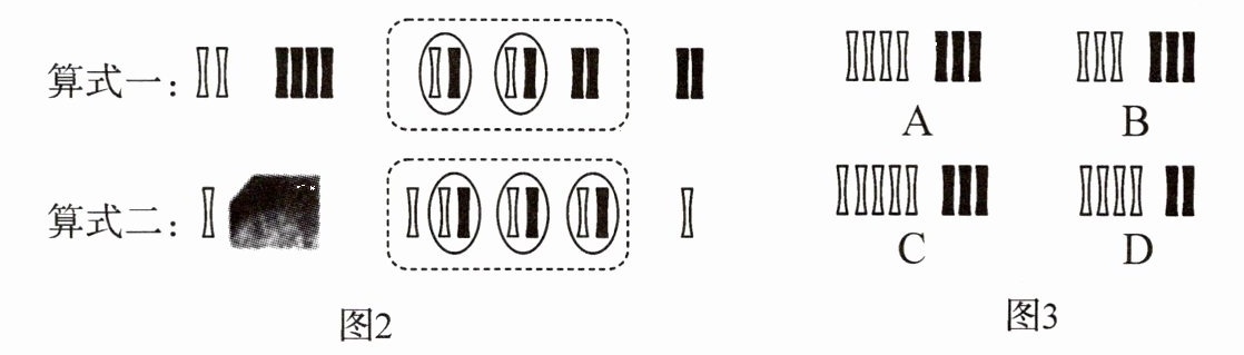 (2) 筹算是中国古代的计算方法之一,宋代数学家用白色筹码代表正数,用黑色筹码代表负数,如图 2,算式一表示的是 (+2)+(-4)=-2. 按照这种算法,请在图 3 的四个选项中,选出算式二中被盖住的部分:. (填字母)