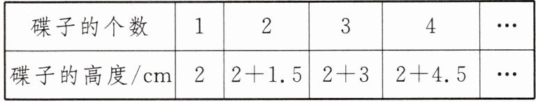 (1) 由表格可知,1个碟子高度为2cm,每增加1个碟子高度增加1.5cm。当有x个碟子时,高度为$2 + 1.5(x - 1)$,化简得$1.5x + 0.5$。故答案为$(1.5x + 0.5)\ cm$。