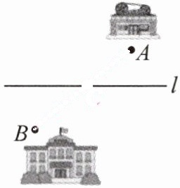 10. 如图,商店 $ A $ 和学校 $ B $ 位于公路 $ l $ 的两侧. 现要在公路 $ l $ 上设立一个公交站 $ C $,使它到 $ A $,$ B $ 两处的距离之和最小. 请在图中画出公交站 $ C $ 的位置,并说明理由.