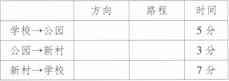 | 新村→学校 | 西南方向(或西偏南$45^{\circ}$) | 1500米 | 7分 |