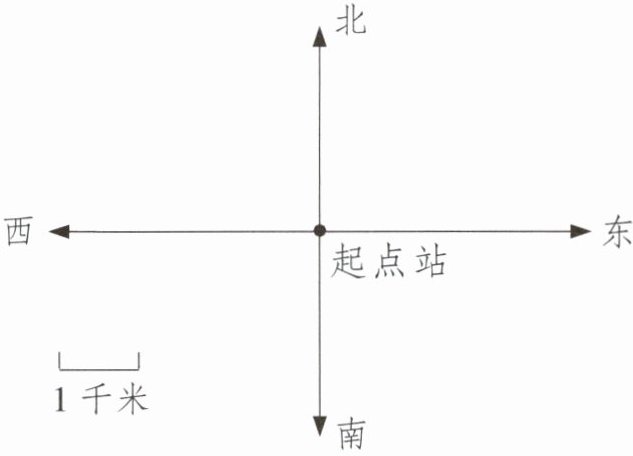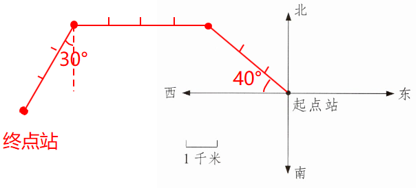 1. 12 路公共汽车从起点站向西偏北 $40^{\circ}$ 方向行驶 3 千米后向西行驶 4 千米,然后向南偏西 $30^{\circ}$ 方向行驶 3 千米到达终点站。根据描述,把汽车行驶的路线画完整。